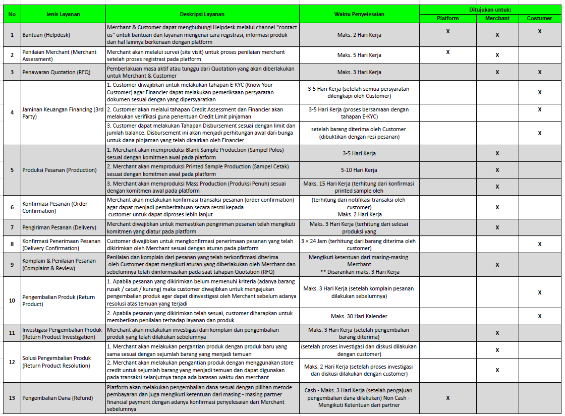 - Customer wajib memastikan bahwa permintaan Produk tidak melanggar Hak Kekayaan Intelektual serta dimiliki dan/atau diijinkan untuk diproduksi secara tidak melawan hukum oleh Merchant.